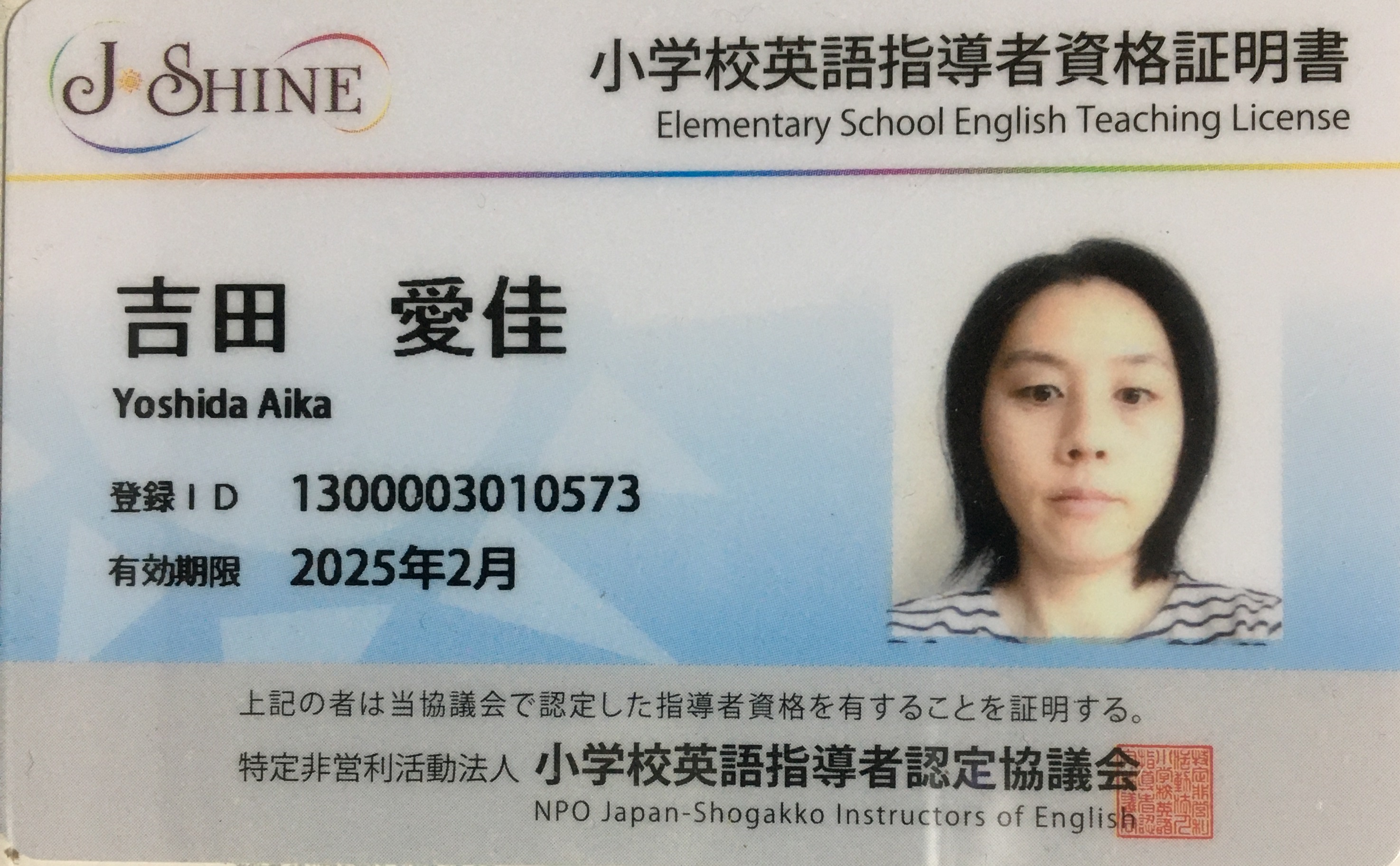 J-SHINE(NPO小学校英語指導者認定協議会)認定資格有